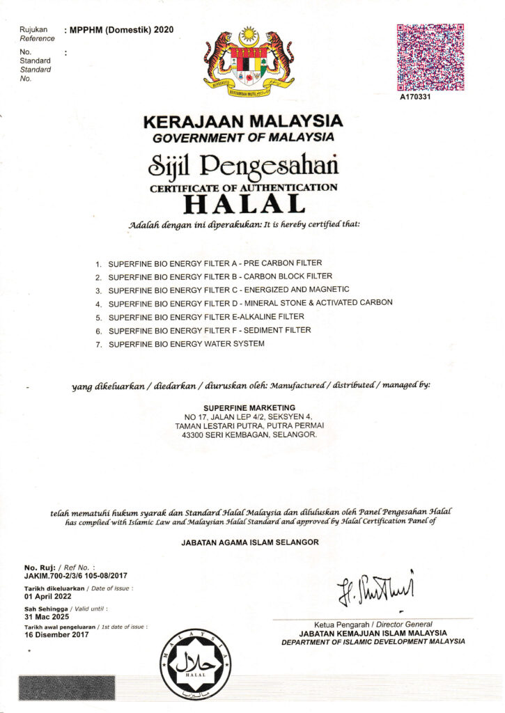 Oleh yang demikian kami bersikap proaktif untuk memastikan semua penapsi air keluaran SuperFine. Kesemua 6 filter termasuk sistem keseluran penapis air SuperFine adalah disahkan halal.